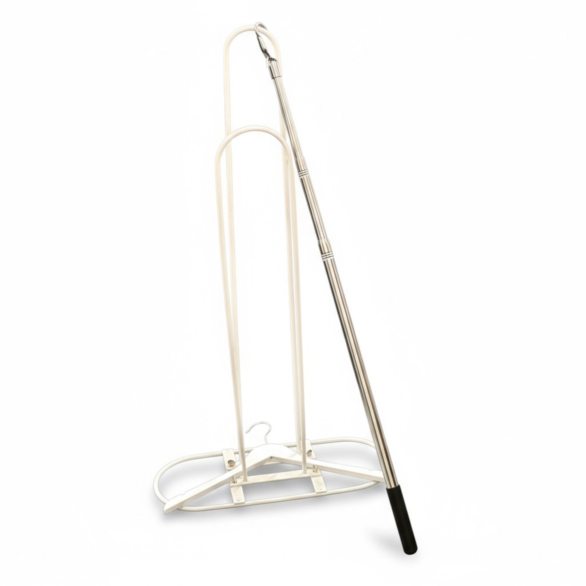| Keyp eitt fullkomið sett – klæðastongur + hæglar fyri klemmur – og spara pengar! Settið inniheldur okkara klassisku klæðastong, sum kann stillast í 2 breiddir, so hon hóskar til tey klemmur, tit nýtast í handlinum. Harumframt fært tú eina álítandi klemmuhæglu, ið kann longdast heilt upp til 170 cm. Útgjørt við málmgaffli og kroki til upphengju, so tú lættliga kanst taka klemmur niður frá sjálvum hægstu stativunum. 1 sett: 1 stk. klemmuhægla (4060-65) 1 stk. klæðastongur í hvítum (4057-65) | Vanligur prísur