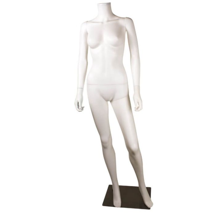 | Dámskur buste uttan høvð við beinunum niður síðu. Heilvísur buste, bíligur til at vísa ymiskar vørur. Busten sæst við eina fýrakantaða metallfótplátu. Hon kemur við bæði fót og leggspíði, soleiðis at tað ber til at seta skógvar á busten. Lætt at arbeiða við á messum og sýningum. Mát: Hædd: 162 cm. Bryst: 82 cm Midja: 61 cm Høft: 89 cm Fótur: 23 cm. | Vanligur prísur