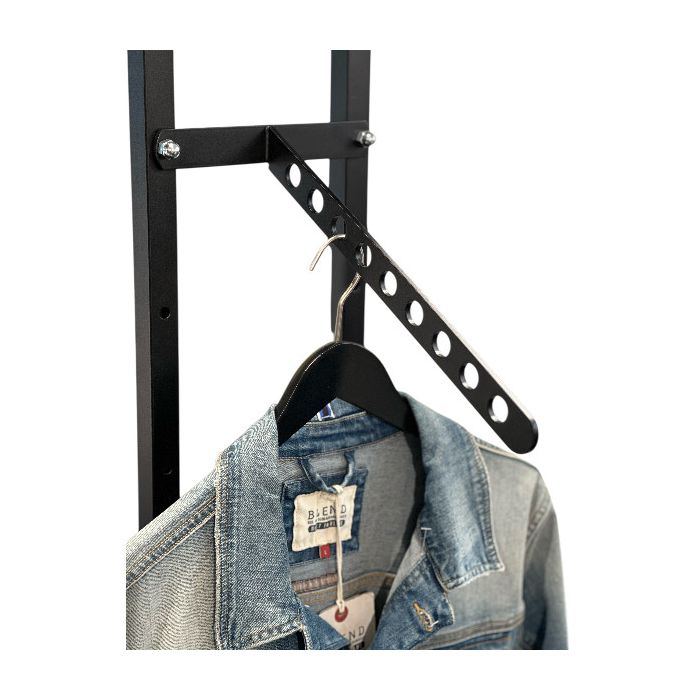 Robust skakt frontheng, sum passar til allar slag av L-garðstativum. Viðkoma boltar við til lættan montasje. Fronthengið hevur 9 hol, soleiðis at tú lættligt kanst framvísa hengjandi klæðir á ein snyggan og yvirskygdan hátt. Sklapt horn ger tað møguligt at hanga longri vørur aftast – uttan at tær skula forða fyri øðrum klædnum. Mát: L 33 cm. Svørt