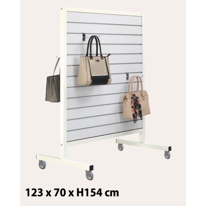 Ein praktisk og stílhild sølugondul í hvítt sniði – við rilluplátu á báðum síðum og eitt sterkt stálskelet. Rillupláturnar gera tað lætt at framseta vørur á krokunum, hillum ella hillarabbarum, og loysnin hentar serstakliga væl til miðstøðissetanir í handlinum, har vørurnar skulu vera sjónligar frá báðum síðum. Ideelt til framseting av klæðum, tilfari, skóm, gávuvørum, imposløg ella kampanjuvørum. Gondulan kann lætt flytast eftir tørvi og hóskar seg til bæði fysiska smáhandil, showroom og pop-up umhvørvi.