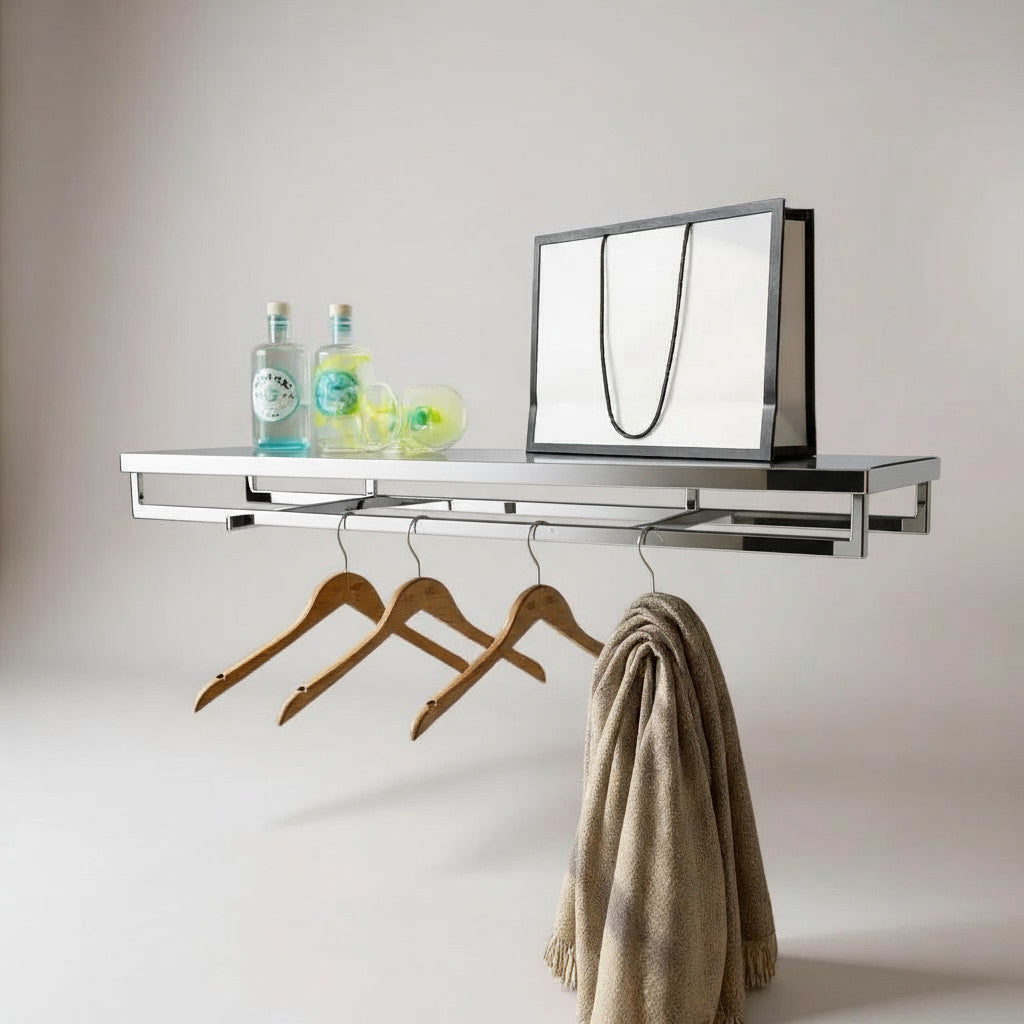 Komplet hylissystem við einum bøjlastanga og tveimum fasthaldandi fronthængum. Harumframt eitt frostað glashylja. Kynnir tín hangandi klæði á ein cool og nútímans hátt við okkara kompletta hylissystemi í kromrammu. Mál: B 120 x D 37 x H 10 cm. Hyljan er til beinleiðis montasje á vegg. HAPPY!-serjan er sniðgivin til at passa inn í einstakar designstílir og at skapa eitt minimalistiskt og vakurt uttrykk í hvørjari butik ella heim. Brúka HAPPY!-serjuna í øllum handlinum ella í einum dedikeraðum søluøki.