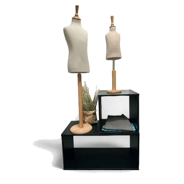 Kube - Podier, sett við 2 stk. Tvey podiini í settinum kunnu nýtast saman til eina fjøldimensjónal framseting ella hvør fyri seg, alt eftir hvør tørvur er at vísa ymiskar vørur við ymiskum hæddum og vinklum. Vit mæla til at leggja breiðu kubbuna liggjandi. Mát: 40 x 40 x H40 cm. 80 x 40 x H40 cm - verður eftirløgd. Svørt melamin. Prísurin er fyri eitt sett av kubbum (2 stk.)