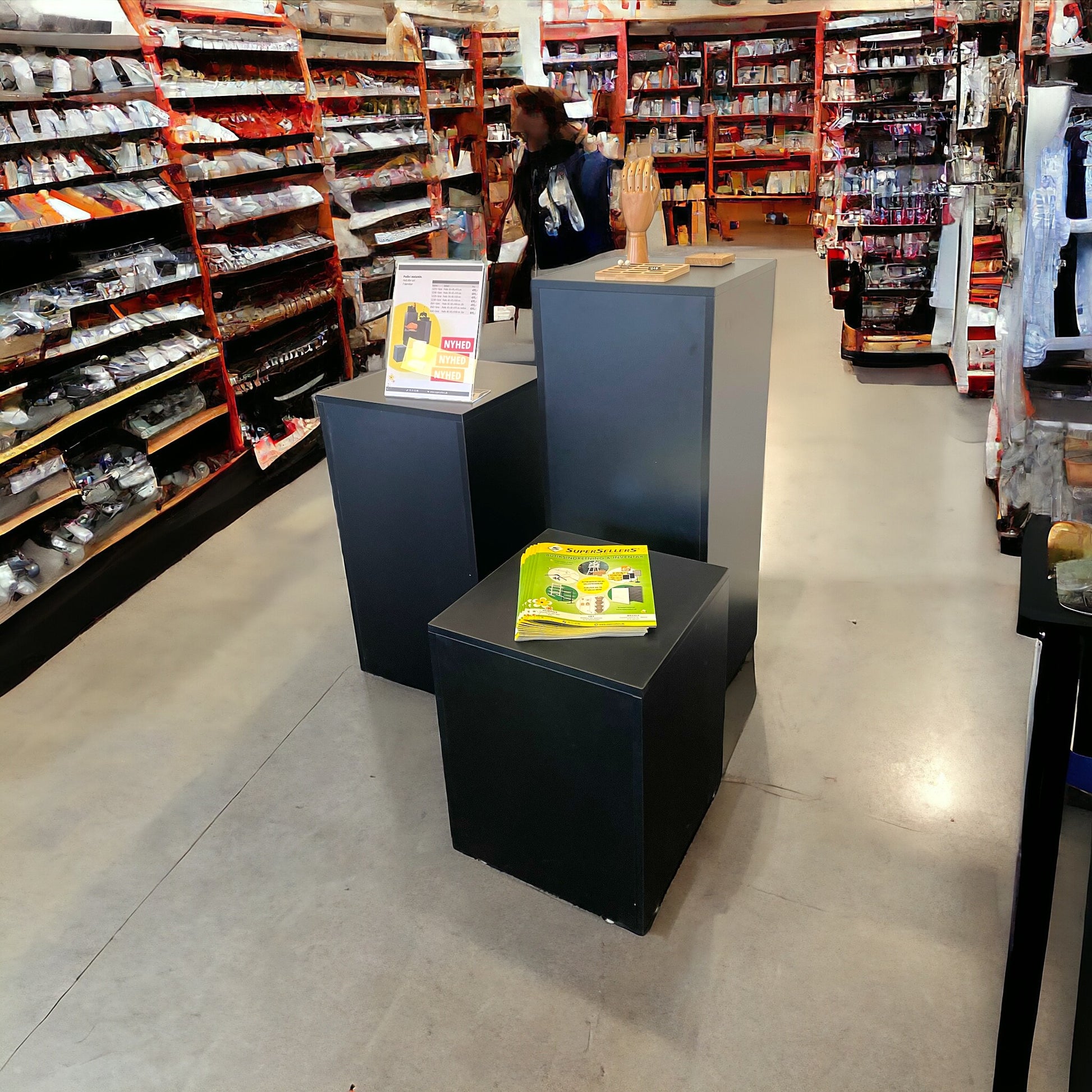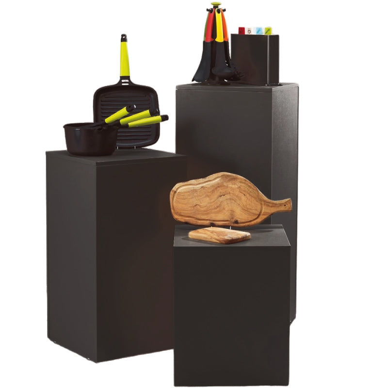 Sett við trimum podiumum í svørtu. Hönnað úr haldføri melamin. Hvørt podium hevur ein maksimalt burðarkapasitet uppá 50 kg. Settið verður levert ósamlað, og prísurin inniber øll trý podium. Ideelt til framvísing av vørum ella dekoratiónir í øllum rúmi. Mál: 40 x 40 x H100 cm, 40 x 40 x H75 cm og 40 x 40 x H50 cm. Prísurin er fyri eitt sett við 3 podium