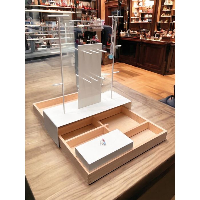 | Smykkedisplay í ljósari træ og hvítt. Træbakki við løst rumdeling. Metalstongur við hangidiskum í hvítt. Blokk til framvísing og skiltahaldari í hvítt. Øll lutir eru lausar. Bakkin kann nýtast uttan tilhoyr. Við tilhoyrinum kann bakkin innrættast á óteljandi mátar | Vanligur prísur